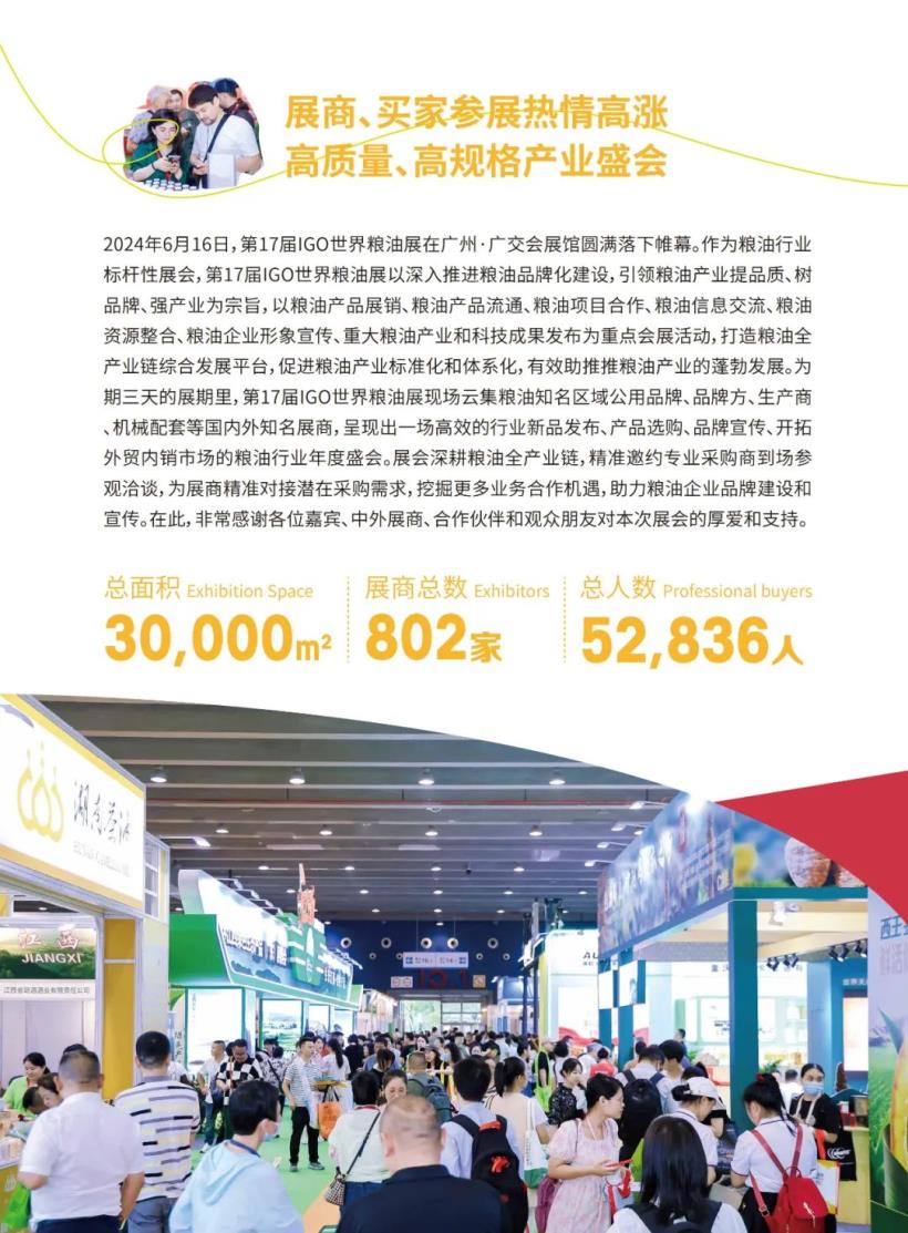 024年6月16日,第17屆IGO世界糧油展在廣州·廣交會(huì)展館圓滿(mǎn)落下帷幕。作為糧油行業(yè)標(biāo)桿性展會(huì),第17屆IGO世界糧油展以深入推進(jìn)糧油品牌化建設(shè),引領(lǐng)糧油產(chǎn)業(yè)提品質(zhì)、樹(shù)品牌、強(qiáng)產(chǎn)業(yè)為宗旨,以糧油產(chǎn)品展銷(xiāo)、糧油產(chǎn)品流通、糧油項(xiàng)目合作、糧油信息交流、糧油資源整合、糧油企業(yè)形象宣傳、重大糧油產(chǎn)業(yè)和科技成果發(fā)布為重點(diǎn)會(huì)展活動(dòng),打造糧油全產(chǎn)業(yè)鏈綜合發(fā)展平臺(tái),促進(jìn)糧油產(chǎn)業(yè)標(biāo)準(zhǔn)化和體系化,有效助推推糧油產(chǎn)業(yè)的蓬勃發(fā)展。