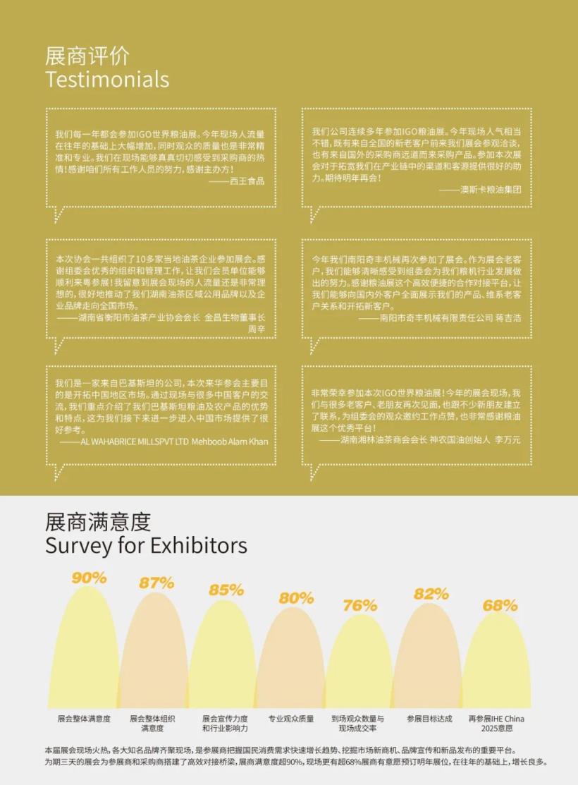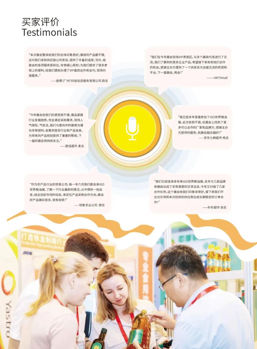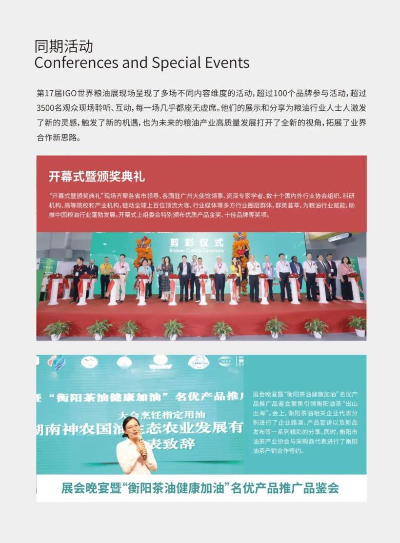 為期三天的展期里,第17屆IGO世界糧油展現(xiàn)場(chǎng)云集糧油知名區(qū)域公用品牌、品牌方、生產(chǎn)商、機(jī)械配套等國(guó)內(nèi)外知名展商,呈現(xiàn)出一場(chǎng)高效的行業(yè)新品發(fā)布、產(chǎn)品選購(gòu)、品牌宣傳、開(kāi)拓外貿(mào)內(nèi)銷(xiāo)市場(chǎng)的糧油行業(yè)年度盛會(huì)。展會(huì)深耕糧油全產(chǎn)業(yè)鏈,精準(zhǔn)邀約專(zhuān)業(yè)采購(gòu)商到場(chǎng)參觀洽談,為展商精準(zhǔn)對(duì)接潛在采購(gòu)需求,挖掘更多業(yè)務(wù)合作機(jī)遇,助力糧油企業(yè)品牌建設(shè)和宣傳。在此,非常感謝各位嘉賓、中外展商、合作伙伴和觀眾朋友對(duì)本次展會(huì)的厚愛(ài)和支持。