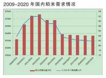 (一)口糧需求持續(xù)減少,隨著我國經(jīng)濟發(fā)展和人們消費觀念的變化,人均大米口糧需求持續(xù)下降,大米食用消費逐年減少。國家糧油信息中心預(yù)測,2019/2020年度我國稻谷食用需求為15830萬噸,較上年度減少20萬噸,較2012/2013年度減少1470萬噸。2012年以來,我國口糧大米需求減少較快。2015年以后,口糧大米需求降幅減緩,但每年仍以20萬~30萬噸的幅度在減少。2018年我國人均大米口糧消費為81.7公斤,較2012年下降10.3公斤。