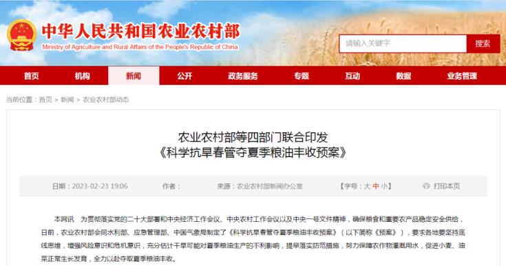 近日,農(nóng)業(yè)農(nóng)村部會(huì)同水利部、應(yīng)急管理部、中國氣象局制定了《科學(xué)抗旱春管奪夏季糧油豐收預(yù)案》,要求各地要堅(jiān)持底線思維,增強(qiáng)風(fēng)險(xiǎn)意識(shí)和危機(jī)意識(shí),充分估計(jì)干旱可能對(duì)夏季糧油生產(chǎn)的不利影響,提早落實(shí)防范措施,努力保障農(nóng)作物灌溉用水,促進(jìn)小麥、油菜正常生長發(fā)育,全力以赴奪取夏季糧油豐收。