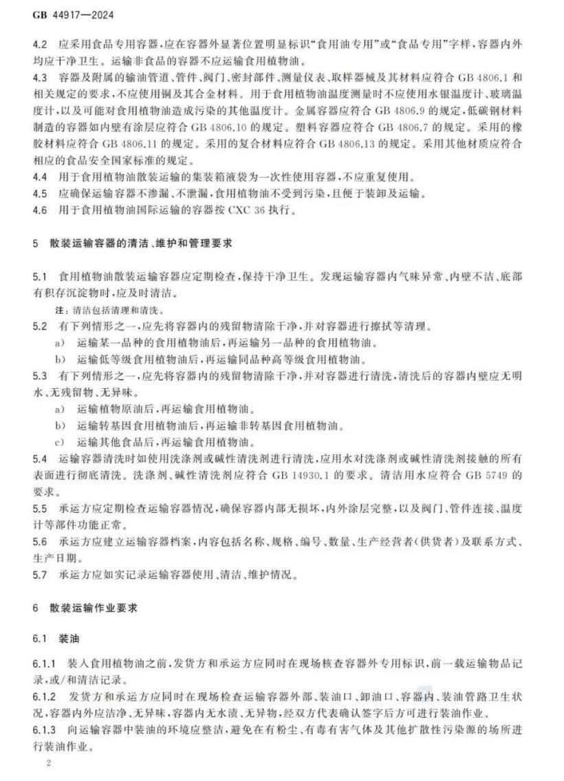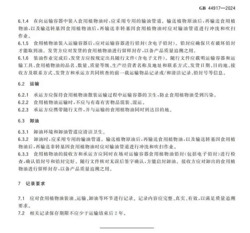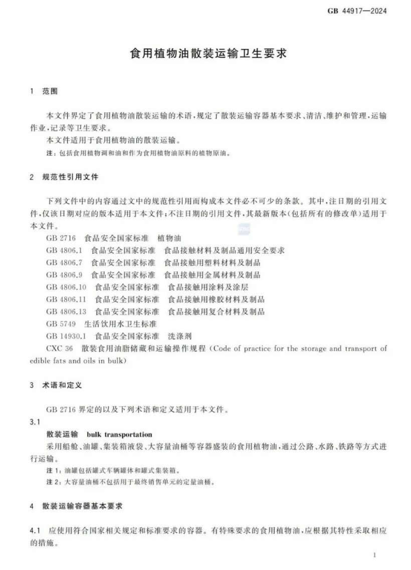 新國標(biāo)為強制性標(biāo)準(zhǔn),對“散裝運輸”做出了具體定義:散裝運輸是指“采用船艙、油罐、集裝箱液袋、大容量油桶等容器盛裝的食用植物油通過公路、水路、鐵路等方式進(jìn)行運輸?!?/p>